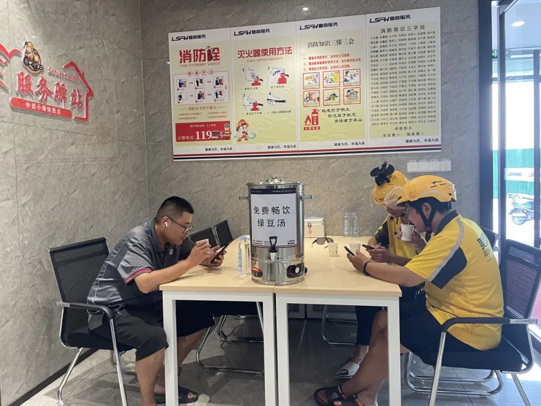 驛站為快遞小哥們準備了桌椅板凳、應急藥箱,同時準備了綠豆湯等免費飲品,能夠滿足快遞小哥們吃飯、交流和簡單的休息需求。“我們希望通過驛站的建立,更廣泛、更直接、更有效的服務新就業形態勞動者,用實際行動踐行詮釋‘五心’服務理念。同時,也方便他們更好地服務我們的業主,實現善意的循環,共同營造溫馨、和諧的社區環境。”鳳凰廣場項目負責人表示。