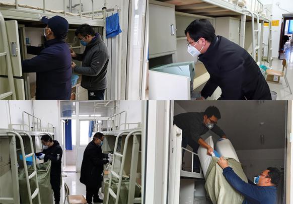 隔離場所建設期間,道路交通暫未完全恢復,這給老師們到校工作帶來了諸多不便。學校餐廳尚未供餐,餐飲行業也未復工,老師們紛紛從家中帶水帶飯,自行解決伙食問題。天氣嚴寒,但老師們的“戰斗”熱情絲毫不減。20多名黨員干部在充分做好個人防護的情況下,克服重重困難,認真清掃房間、搬運物品、衛生消毒、設置醫用物品,最終收拾整理出36個干凈衛生、設施齊全的房間作為隔離場所。按照疾控中心規定,均已達到了作為隔離場所的標準要求。