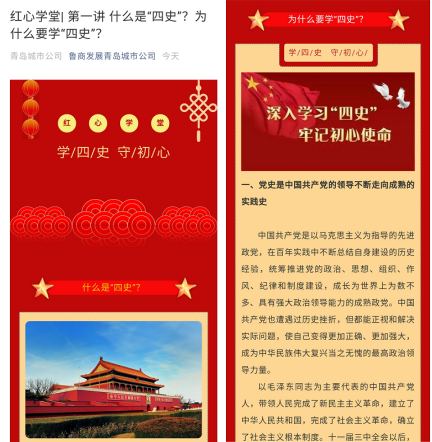 歷史是最好的教科書,黨史、新中國史、改革開放史、社會主義發展史是“四史”學習教育的四大板塊,更是全體黨員干部的必修課。為切實把“四史”作為思想武裝的重中之重,加強教育與自省,2021年2月18日,魯商發展青島城市公司黨總支晴虹黨建之“紅心學堂”正式上線!
