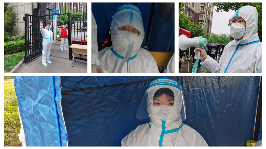 作為志愿者,黨員朱曉敏、張素文身穿防護服,戴著防護面罩,在社區協助醫護人員進行人員信息登記及采樣工作,加班加點,一刻不停,用自身行動開啟抗疫“加速度”。