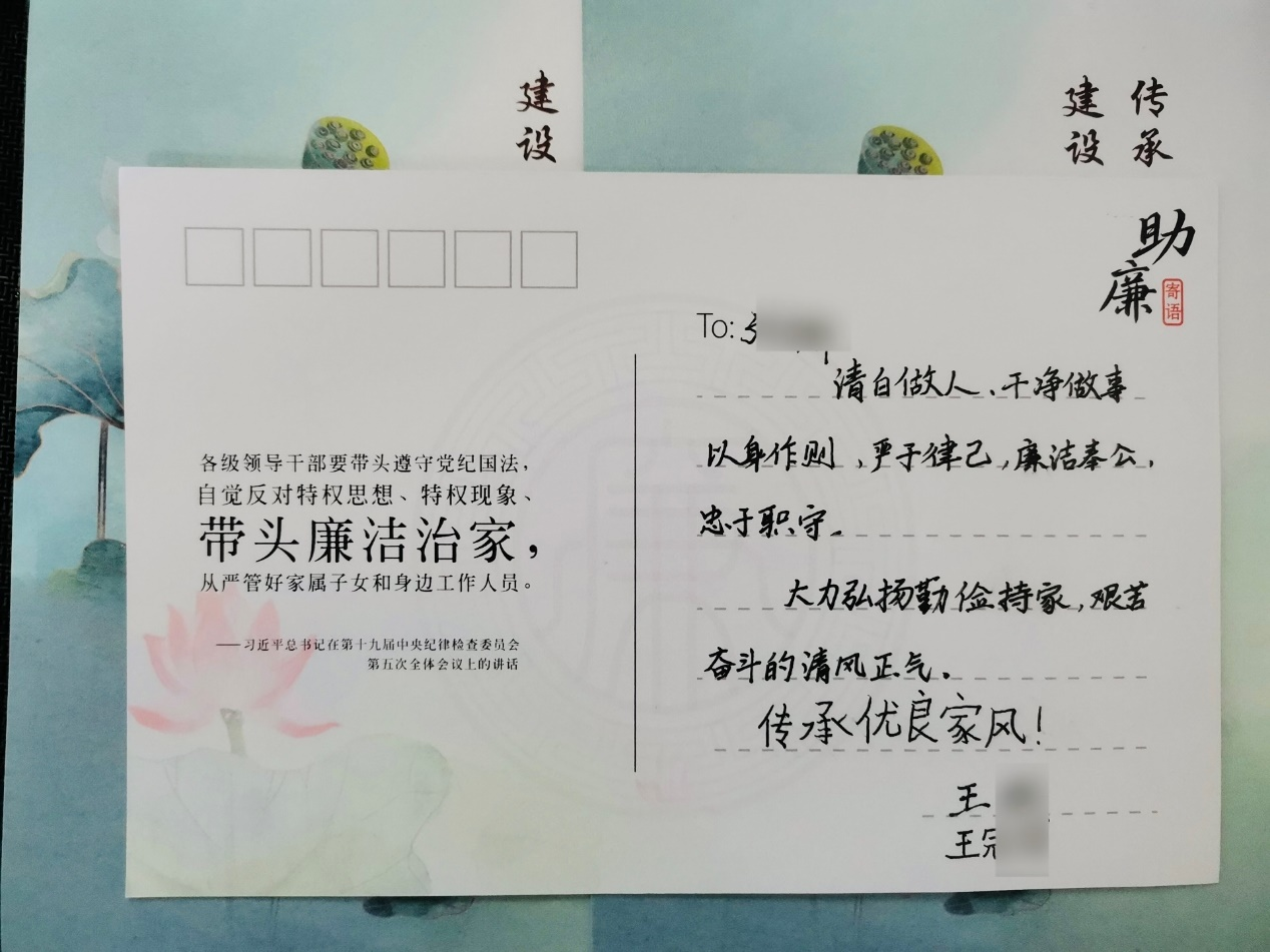 省藥科院紀委向黨員干部家屬寄出《致省藥科院黨員干部家屬的一封信》,并征集“家庭助廉·親情寄語”。一張張卡片闡述著清廉、敬業、節儉、孝順的家風家訓,傳遞著家屬對黨員干部們的關愛與提醒,進一步推進了監督預防關口前移。