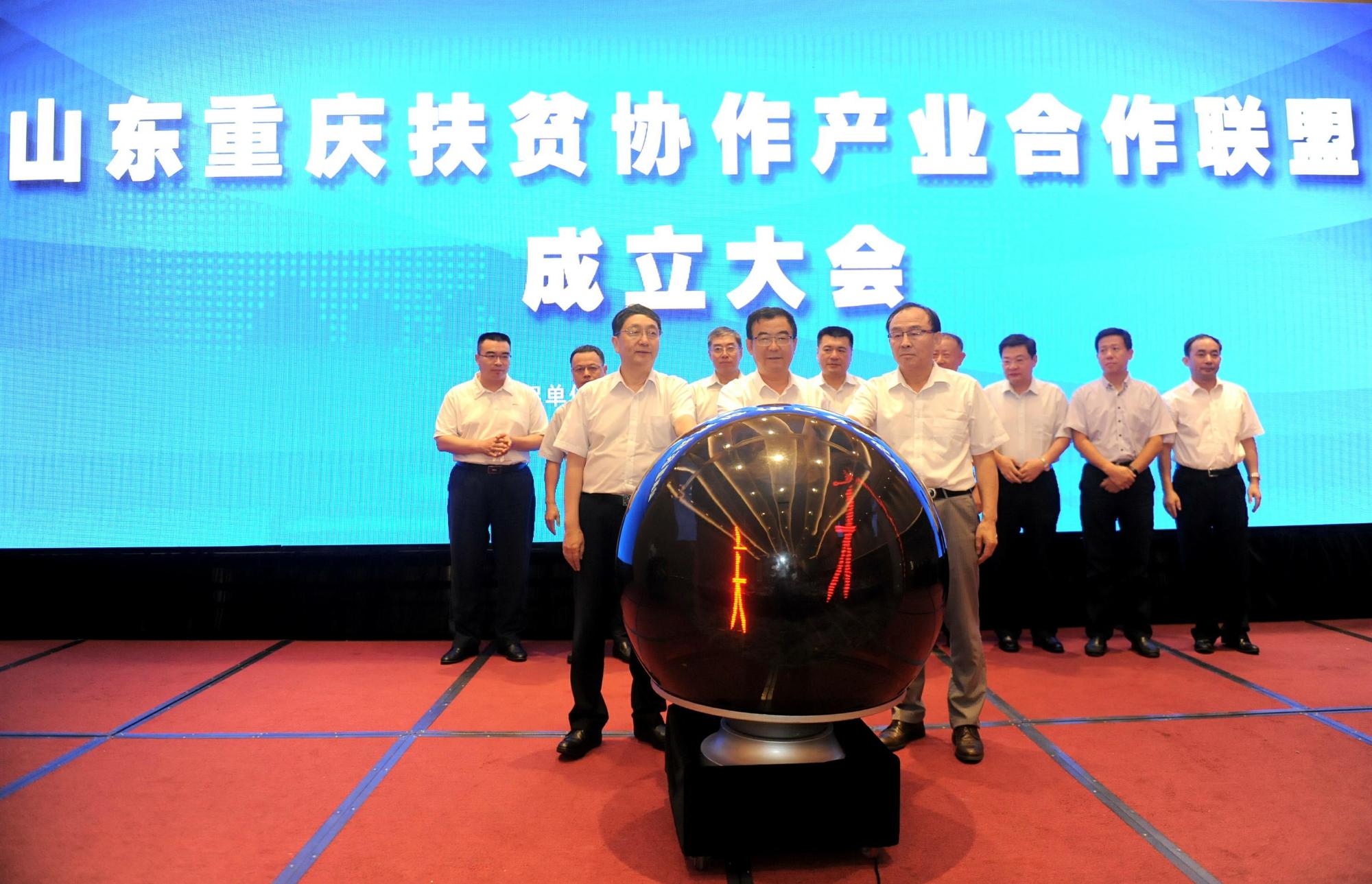 成立大會(huì)由山東省發(fā)改委、魯商集團(tuán)共同主辦。重慶市政府副秘書(shū)長(zhǎng)、市發(fā)改委副主任、市扶貧辦副主任趙鋒,魯商集團(tuán)黨委副書(shū)記、總經(jīng)理、第一屆山東重慶扶貧協(xié)作產(chǎn)業(yè)合作聯(lián)盟理事長(zhǎng)凌沛學(xué)出席;山東扶貧協(xié)作重慶掛職干部,山東省直有關(guān)部門(mén)、重慶市直有關(guān)部門(mén)、山東承擔(dān)扶貧協(xié)作重慶任務(wù)的14市有關(guān)部門(mén)負(fù)責(zé)同志,聯(lián)盟會(huì)員企業(yè)負(fù)責(zé)人參加;山東省發(fā)改委對(duì)口支援協(xié)調(diào)處處長(zhǎng)謝恩年主持會(huì)議。魯商集團(tuán)出任魯渝扶貧產(chǎn)業(yè)聯(lián)盟首任理事長(zhǎng)單位,省發(fā)展投資集團(tuán)、山東高速集團(tuán)、山東能源集團(tuán)、中國(guó)重汽集團(tuán)等企業(yè)出任副理事長(zhǎng)單位。