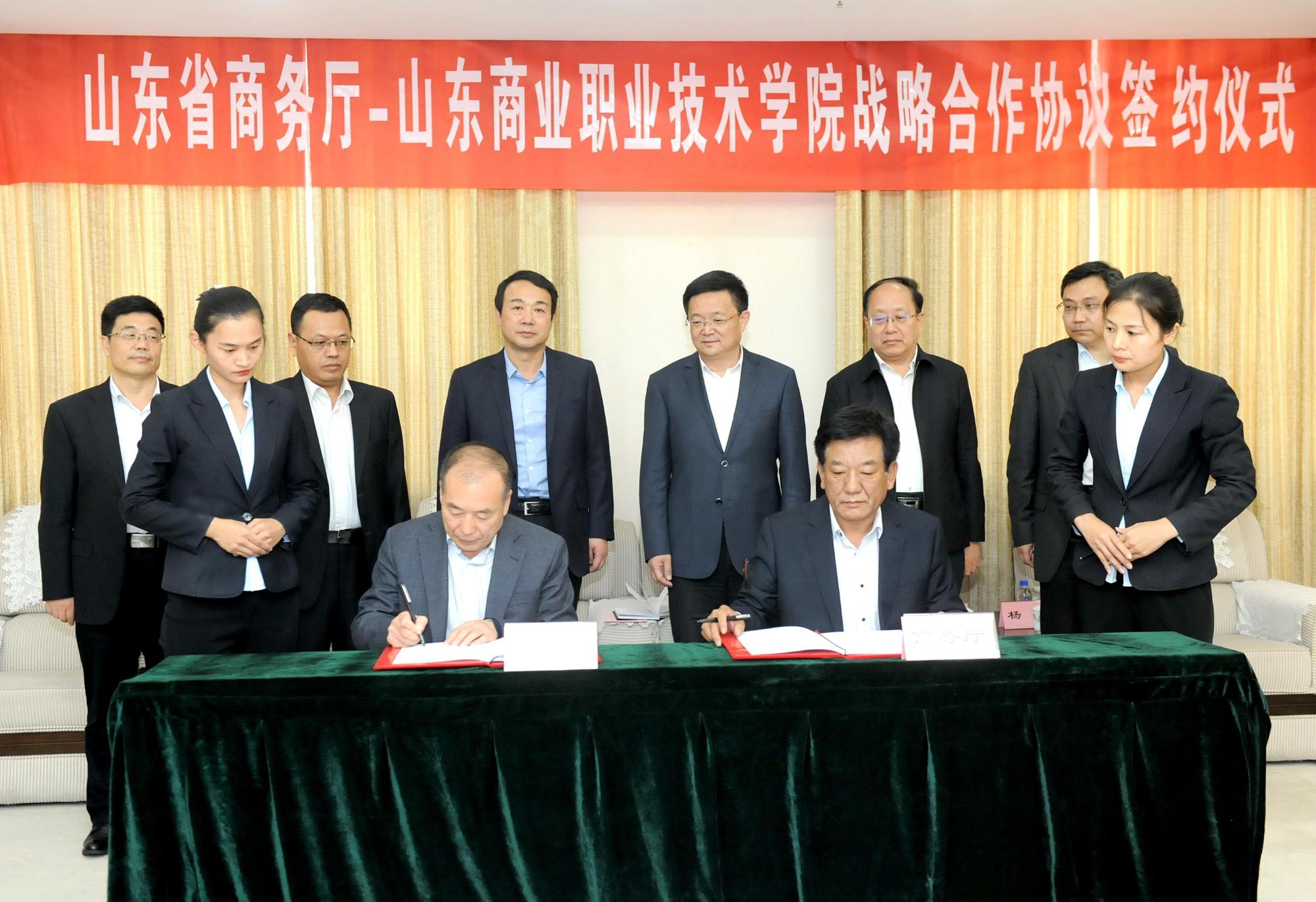 10月11日下午,山東省商務廳與山東商業職業技術學院(簡稱山東商院)簽署戰略合作協議。山東省商務廳黨組書記、廳長佘春明,山東省商務廳副廳長王洪平,魯商集團黨委書記、董事長高洪雷,魯商集團黨委副書記劉守亮共同出席簽約儀式。