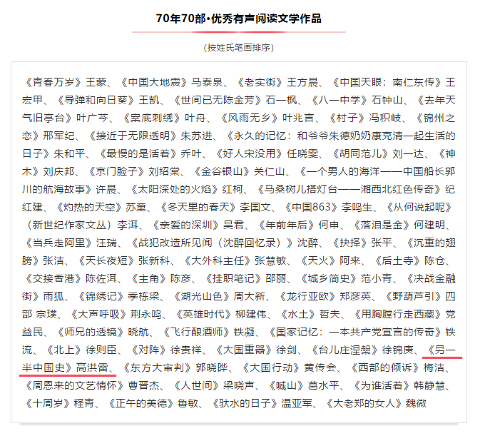 10月30日,由中廣聯合會有聲閱讀委員會主辦的“中國有聲”——“70年70部·優秀有聲閱讀文學作品”發布會在北京廣播大廈隆重舉行。中國作家協會會員,中國自然資源作家協會副主席,省商業集團有限公司黨委書記、董事長兼省文旅集團董事長高洪雷作品《另一半中國史》入選“70年70部·優秀有聲閱讀文學作品”名單。該書由中央廣播電視總臺央廣中國之聲首席主播蘇揚全文演播。