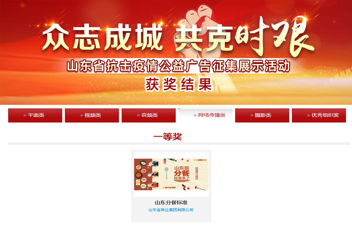 近日,“眾志成城 共克時艱”山東省抗擊疫情公益廣告評選結果公布,由省商業集團有限公司(簡稱魯商集團)報送的H5作品《山東版分餐標準來了》,榮獲網絡傳播類唯一一等獎,這也是省屬企業唯一的一等獎獲獎作品。