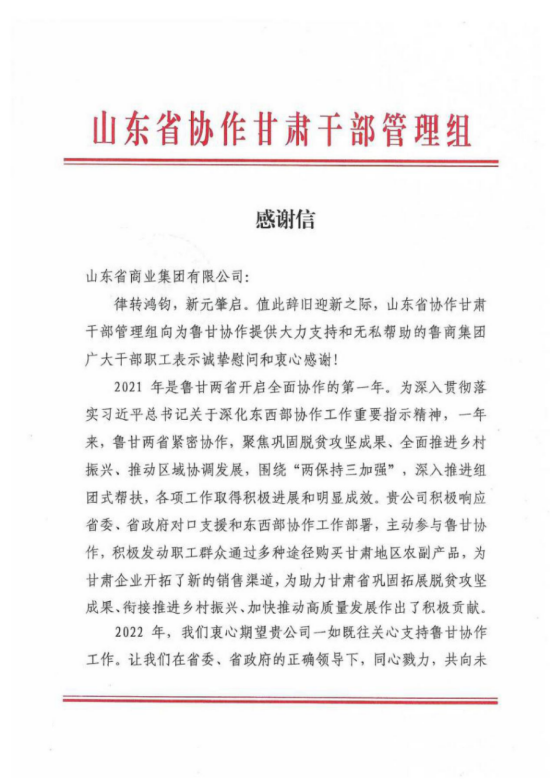 感謝信中表示,魯商集團認真貫徹省委、省政府對對口支援和東西部協作工作的部署安排,緊緊圍繞總目標推動支援協作工作更好發展,踴躍參與我省對口支援消費幫扶工作,主動履行政治責任和社會責任,積極發動職工群眾通過多種途徑購買幫扶地區農副產品,為助力西部地區人民鞏固拓展脫貧攻堅勝利成果,助推協作區縣鄉村振興,為我省對口支援西部地區建設工作作出突出貢獻。