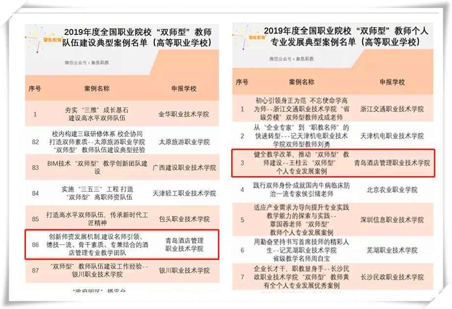近日,教育部職業(yè)技術教育中心研究所發(fā)布《2019年度全國職業(yè)院校“雙師型”教師隊伍建設典型案例》,青島酒店管理職業(yè)技術學院(簡稱青島酒店管理職院)兩個案例成功入選。