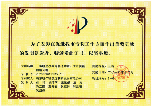 近日,濟南市知識產權局發布《關于授予2017年度濟南市專利獎的決定》,山東明仁福瑞達制藥股份有限公司發明專利“一種明顯改善胃腸道功能、防治便秘的組合物”榮獲濟南市專利獎三等獎。