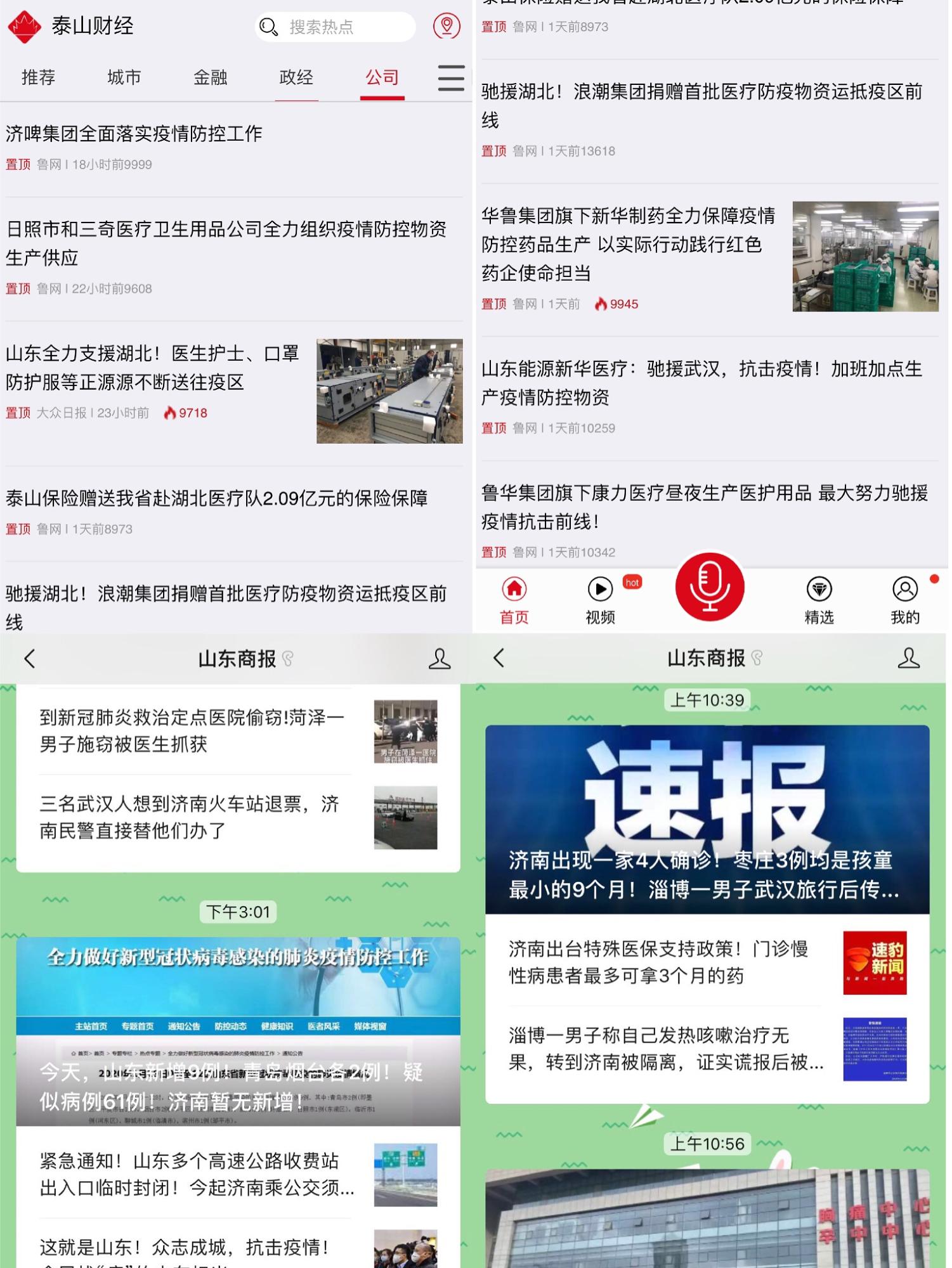 山東商報和魯網官方微信緊急爭取到由一日三次推送增加至一日八次推送的權限,實現了疫情防控特殊時期重大節點重要新聞的及時推送。魯網一直處于24小時在線工作狀態,在網站和泰山財經客戶端開設抗擊疫情專題,實現了疫情相關新聞的不間斷更新;速豹新聞客戶端開設抗擊疫情專欄,與山東馳援武漢醫護人員保持聯系,推出了“前方日記”,采寫了大量感人至深的報道。