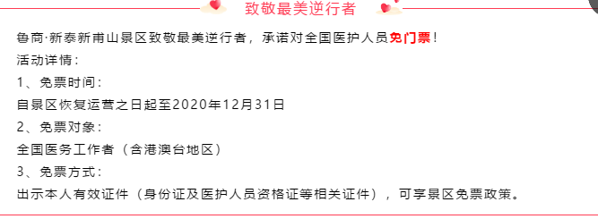 致敬逆行,感恩天使。為向奮戰在抗擊新冠肺炎疫情一線的醫務工作者致敬,2月14日,山東省文旅集團與全國省級國有集團聯盟共同發起“勝利后,讓我們重啟2020的美好”——致敬白衣戰士愛心公益活動,省文旅集團旗下魯商·銀座天蒙旅游區、魯商·新泰新甫山景區率先發布公告,2020年內向全國醫務工作者免費開放,邀請他們在戰勝疫情后到景區放松身心。