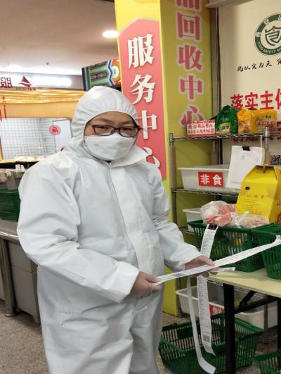 作為工作在零售系統(tǒng)最前沿的收銀員工,因崗位的特殊性,每天要與大量的顧客接觸。為保護(hù)好員工,也為保證顧客安全,馬寧四處聯(lián)系購買防護(hù)服、口罩、手套、頭套等防護(hù)物資,在病毒肆虐的早期,就將收款員進(jìn)行了從頭到腳的“全副武裝”。在馬寧的帶領(lǐng)下,門店收款區(qū)域堅持每半小時一消毒;她還給每位收銀員都配備了小瓶配置好的酒精,以便隨時消毒;安排每位在崗員工輪流、多次到門外空曠處呼吸新鮮空氣,全力保障員工身心安全。同時,員工吃飯時她來頂崗,客流量大時她加開款臺進(jìn)行增援。馬寧總能出現(xiàn)在最需要的地方,極大保障了收銀工作的流暢開展。