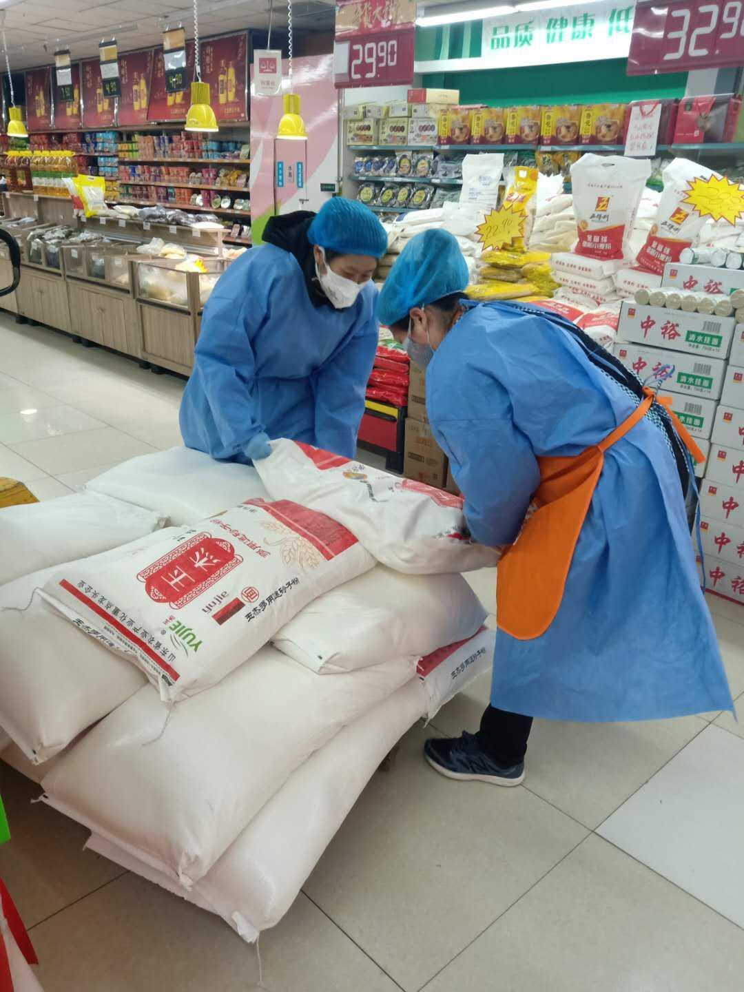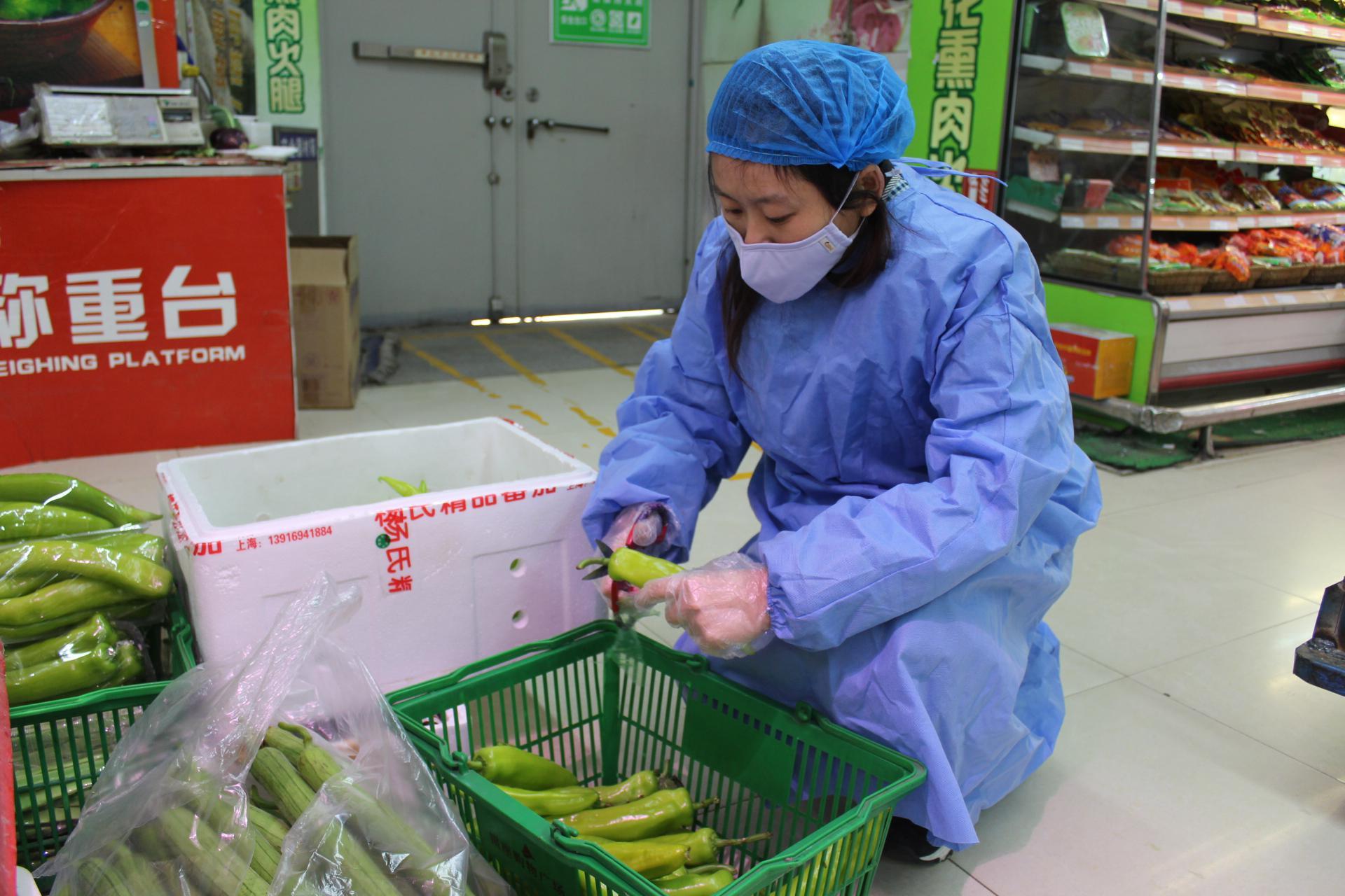 趙叢叢提前穿戴好防護服、手套等,武裝好自己。一天的工作就緊張而有序地開始了:開場前,她要帶領團隊的同事,一起做好貨區消毒,蔬菜區50多個單品、堆架頭20多個單品的上架,線上平臺預訂單接收和備貨、集中配貨,處理線上顧客反映的問題等各項工作。