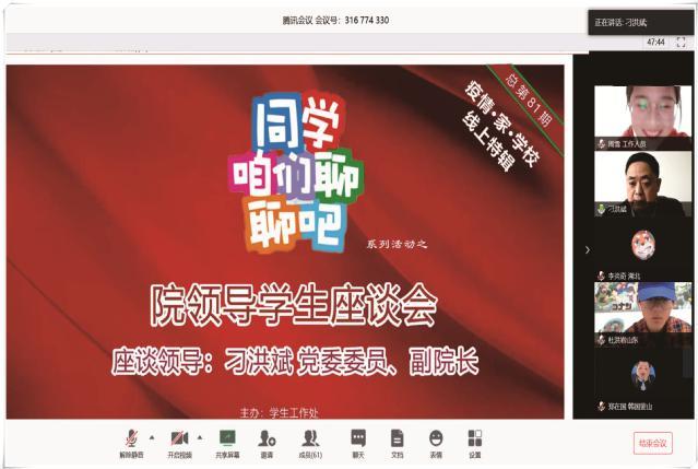 座談會上,學院副院長刁洪斌向來自18個省、市、自治區的52名學生同學們表達了問候,并特別詢問了參加座談的5名湖北籍學生的具體情況。隨后,他就學生們關心的開學時間、開學后的課程安排、疫情期間的頂崗實習、學院的防控措施等問題進行了詳細解答,并與學生連線,“屏對屏,面對面”,聽取了關于線上教學、補課安排、學生活動、快件管理、實習就業等問題的意見和建議。刁洪斌感謝同學們為學校提出的寶貴意見和建議,表示會后將認真論證并向相關負責人反應,討論下一步的調整或改進措施。最后,他希望同學們“嚴格自律,做好居家學習和生活,過好每一天,九水東路599號隨時準備迎接同學們平安歸來”。
