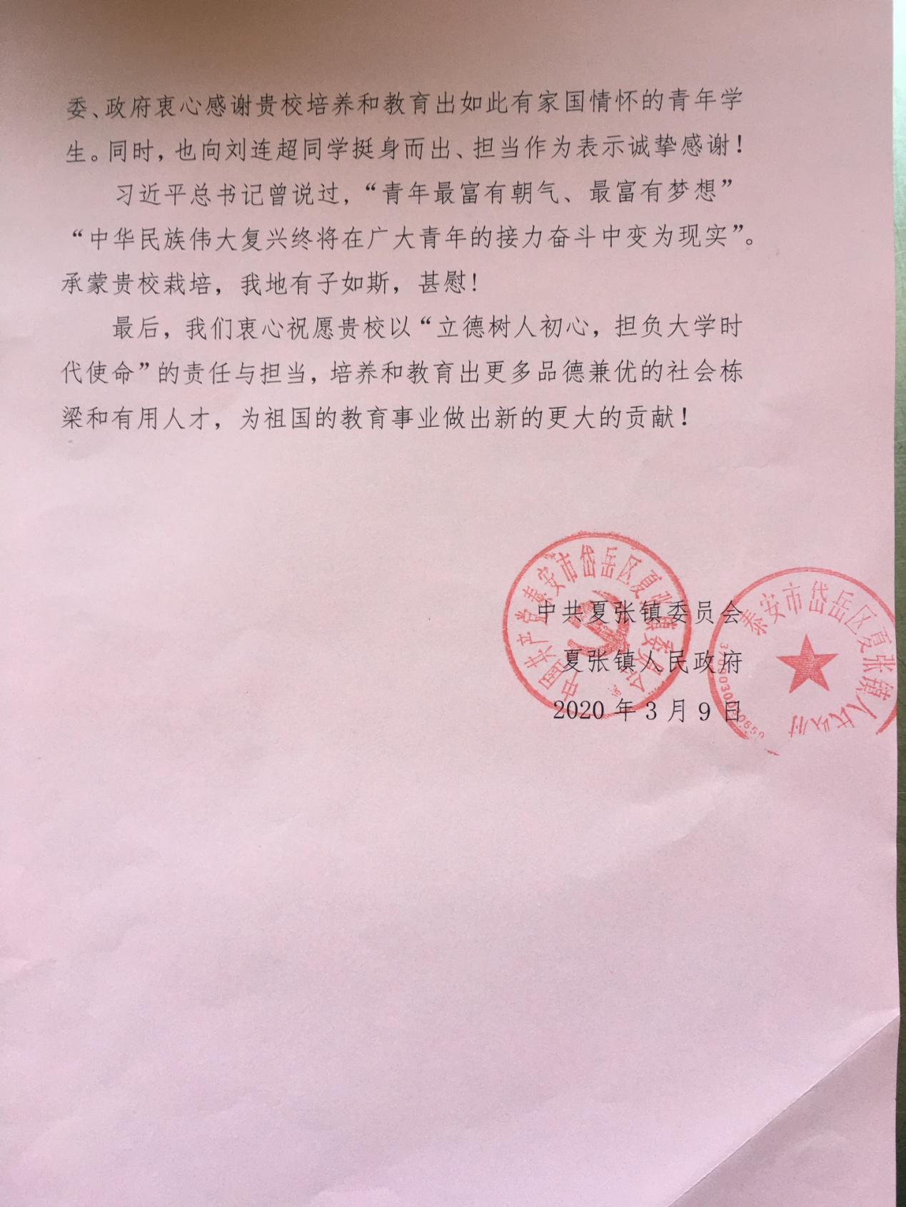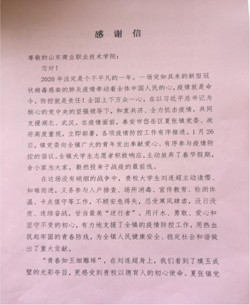 近日,山東商院收到了一封來自泰安市岱岳區(qū)夏張鎮(zhèn)的感謝信,信中對(duì)學(xué)院劉連超同學(xué)在當(dāng)?shù)匾咔榉揽毓ぷ髦械母冻雠c貢獻(xiàn)表示感謝。