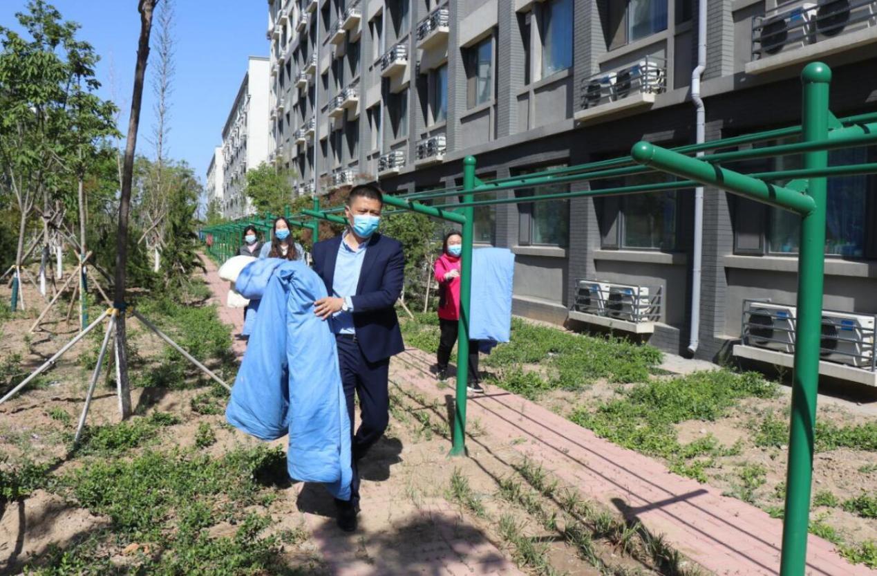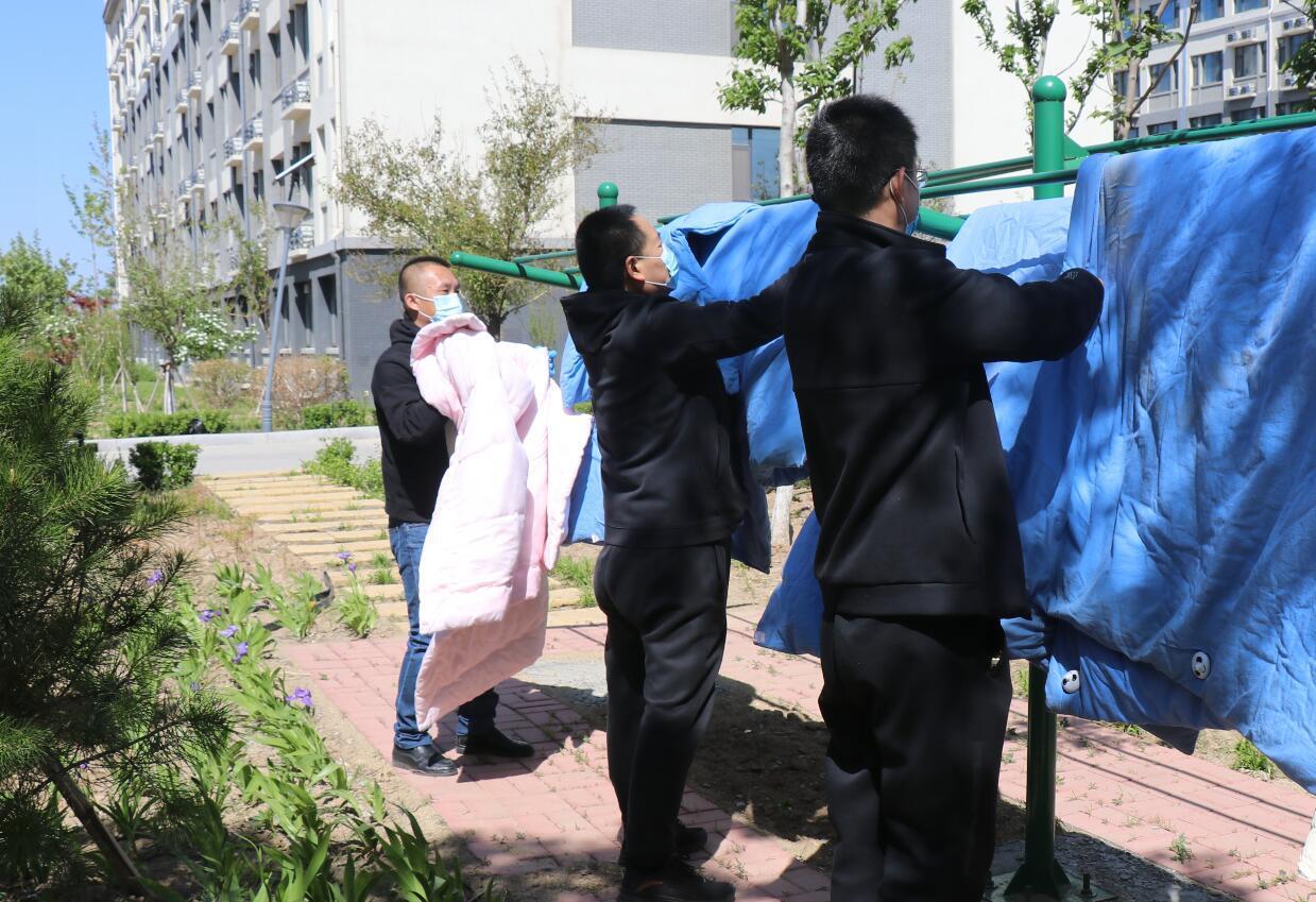 4月20日,團委學生處會同二級學院向同學們發出需求征集信息,學生通過班級群反饋需求,輔導員逐一記錄。4月22日,風輕云淡,陽光正好,70余名老師樓上樓下開始忙碌,把學生被褥抱出宿舍,一件件晾曬在公共晾衣桿上。夕陽西下時,按照標識再一件一件抱回宿舍。