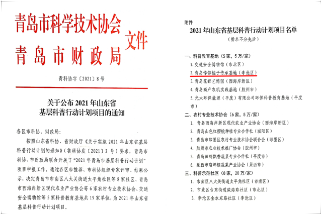 近日,青島市科協(xié)、市財(cái)政局聯(lián)合下發(fā)《關(guān)于公布2021年山東省基層科普行動(dòng)計(jì)劃項(xiàng)目的通知》(青科協(xié)字〔2021〕8號(hào)),青島酒店學(xué)院餑餑榼子傳承基地順利入選。