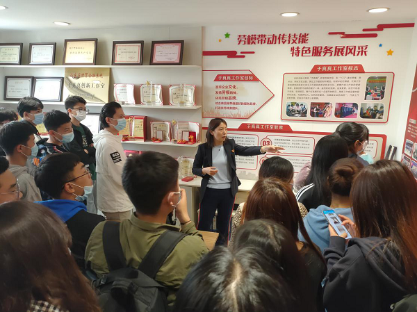 在銀座商城“于真真創(chuàng)新工作室”,速打領(lǐng)帶世界吉尼斯紀(jì)錄保持者、全國勞模、山東省富民興魯勞動(dòng)獎(jiǎng)?wù)芦@得者于真真與同學(xué)們親切交流,并現(xiàn)場(chǎng)展示了速打領(lǐng)帶技能。同學(xué)們被她精益求精、勇攀高峰的事跡所震撼,決心在勞動(dòng)實(shí)踐基地潛心錘煉技能,做齊魯新工匠。