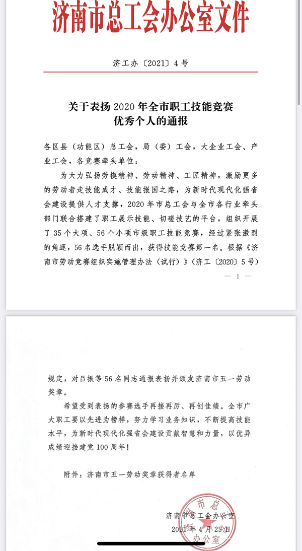 近日,濟南市總工會發布《關于表揚2020年全市職工技能競賽優秀個人的通報》,魯商服務員工馮文君被授予2020年度“濟南市五一勞動獎章”稱號。