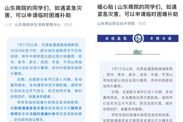 7月17日以來,河南省遭遇極端強(qiáng)降雨,部分地區(qū)受災(zāi)嚴(yán)重。災(zāi)情發(fā)生后,按照省教育廳文件要求和學(xué)校黨委指示,山東商院立即協(xié)調(diào)各二級學(xué)院摸排統(tǒng)計(jì)學(xué)校河南籍學(xué)生受災(zāi)情況,并通過學(xué)校和學(xué)生資助中心微信公眾號發(fā)布《山東商院的同學(xué)們,如遇緊急災(zāi)害,可以申請臨時(shí)困難補(bǔ)助》微信推文,將愛心第一時(shí)間傳遞給受災(zāi)學(xué)生。廣大輔導(dǎo)員第一時(shí)間通過QQ、電話與河南籍學(xué)生取得聯(lián)系,并統(tǒng)計(jì)學(xué)生家中受災(zāi)情況。