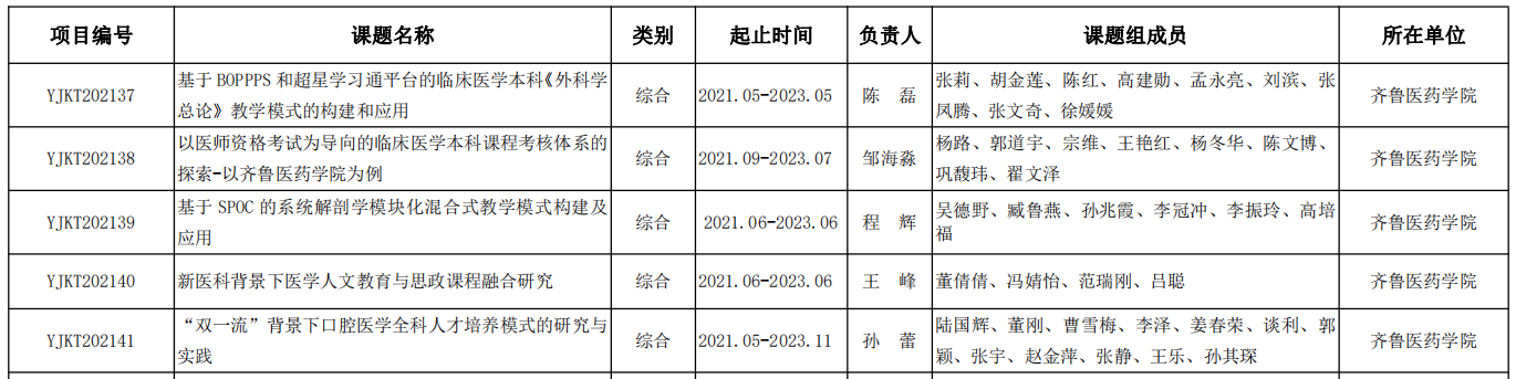 近日,省高等醫學教育研究中心發布《關于公布2021年山東省高等醫學教育研究中心科研規劃課題的通知》,齊魯醫藥學院獲批立項5項課題,分別為《基于BOPPPS和超星學習通平臺的臨床醫學本科<外科學總論>教學模式的構建和應用》《以醫師資格考試為導向的臨床醫學本科課程考核體系的探索——以齊魯醫藥學院為例》《基于SPOC的系統解剖學模塊化混合式教學模式構建及應用》《新醫科背景下醫學人文教育與思政課程融合研究》《“雙一流”背景下口腔醫學全科人才培養模式的研究與實踐》。