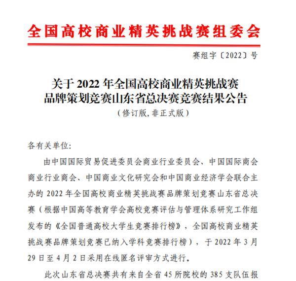 4月4日,2022年全國高校商業(yè)精英挑戰(zhàn)賽品牌策劃競賽山東省總決賽結(jié)束,山東商院9支隊伍在全省385支隊伍中脫穎而出,獲一等獎4項、二等獎4項,三等獎1項,學院獲最佳院校組織獎。