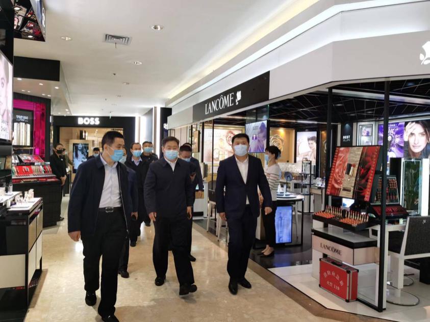 4月13日,臨沂市副市長、市公安局局長任澤龍一行到銀座集團(tuán)臨沂商城店督導(dǎo)防疫保供工作,臨沂商城店總經(jīng)理李振湖陪同。