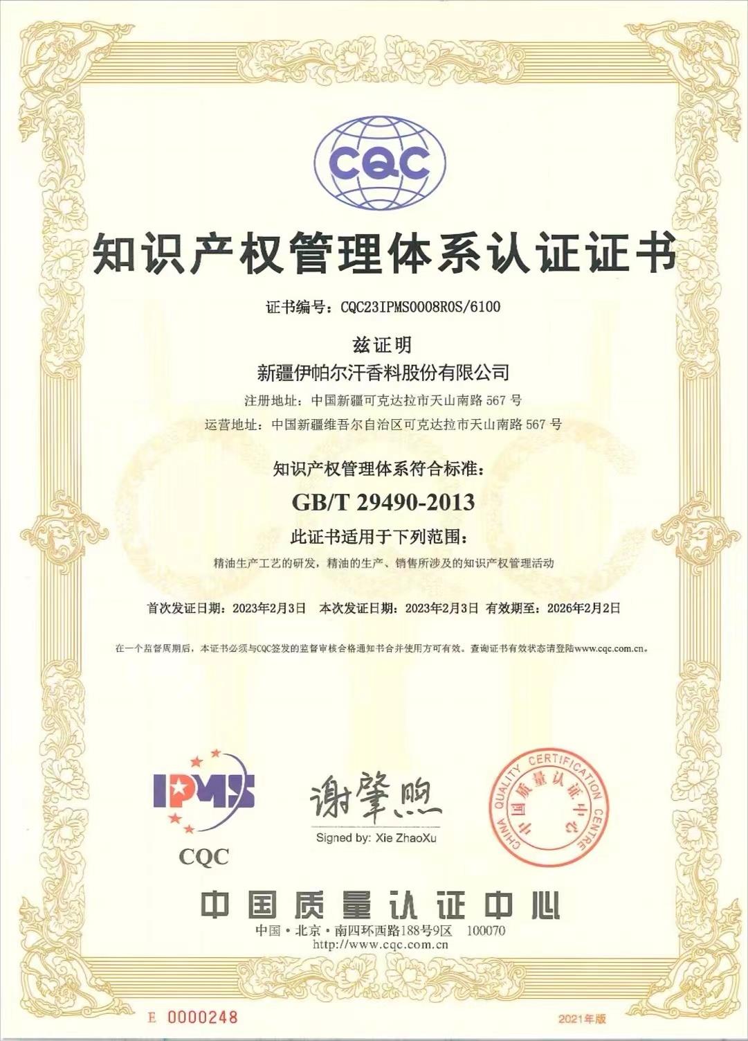 近日,新疆伊帕爾汗獲得中國質(zhì)量認(rèn)證中心(CQC)頒發(fā)的《知識產(chǎn)權(quán)管理體系認(rèn)證證書》。