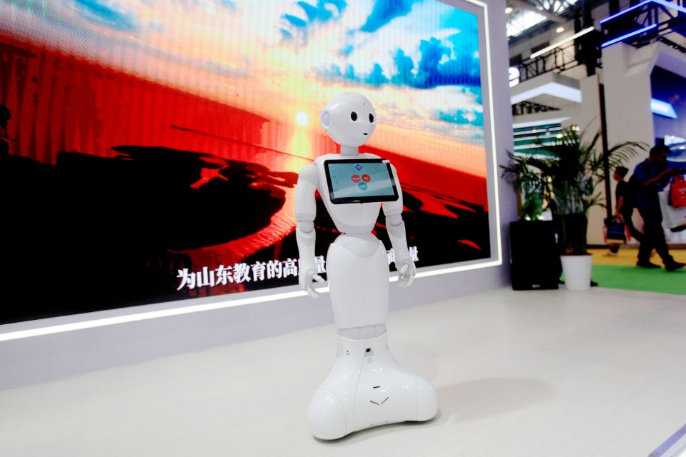 在教博會現(xiàn)場,山東商職學(xué)院自主研發(fā)的機(jī)器人正在與觀展者互動,會跳舞、還能實現(xiàn)對話?!斑@是我們學(xué)校科研團(tuán)隊自去年開始研發(fā)的一款機(jī)器人,后期可用作導(dǎo)覽、健康養(yǎng)老等應(yīng)用場景?!睂W(xué)院應(yīng)用電子系大一學(xué)生李延航對記者說。
