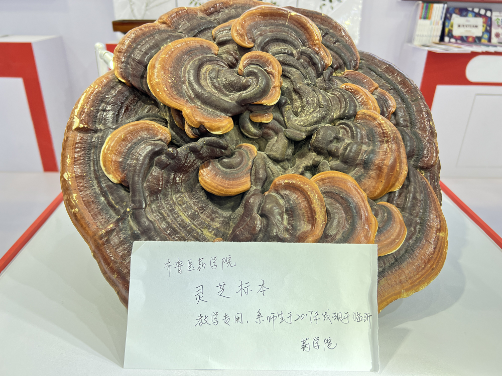 現(xiàn)場的透明玻璃展柜里,一個直徑45厘米的碩大野生靈芝十分引人矚目,旁邊還有水牛角、鹿茸、龜甲、蛤蚧等名貴中藥材,這些都是齊魯醫(yī)藥學(xué)院在現(xiàn)場展示的中藥材教具。此外,還有防風(fēng)、蜀葵、白薇、忍冬等中藥材標(biāo)本,每個藥材標(biāo)本都用一張白紙板裝裱,懸掛在墻上宛若一幅幅畫作,成為獨具特色的一景。