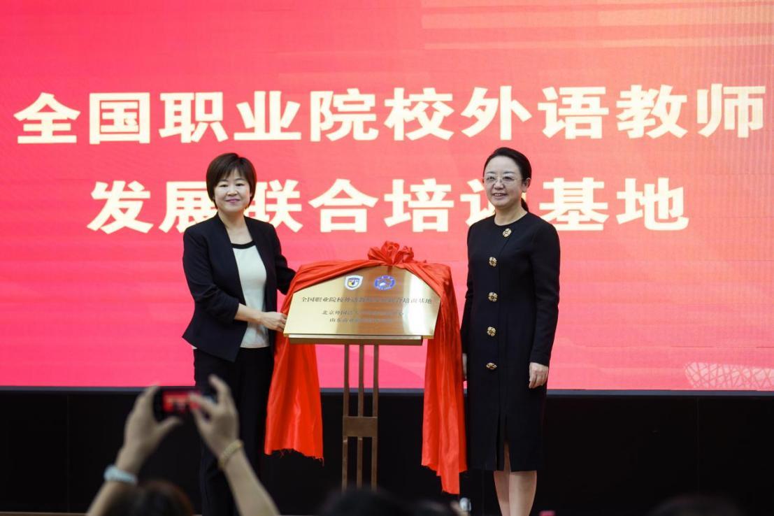 比賽開幕式上,山東商職學院黨委副書記、院長王鑫,外語教學與研究出版社職業(yè)教育出版分社社長李淑靜共同為山東商職學院全國職業(yè)院校外語教師發(fā)展聯(lián)合培訓基地揭牌并致辭。