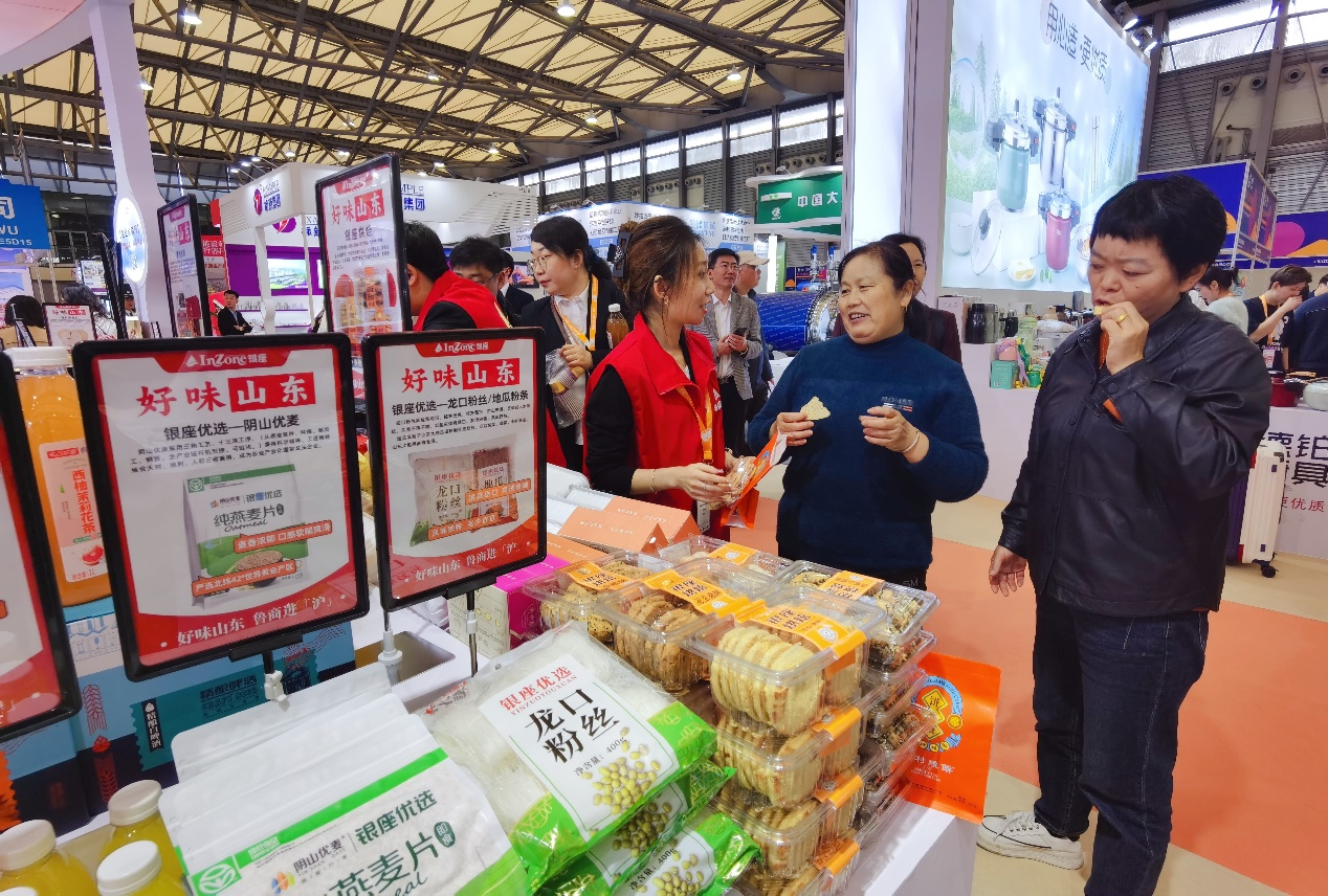 展會現(xiàn)場,銀座集團除精選自有品牌“銀座優(yōu)選”“銀座優(yōu)鮮”好品,還攜山東煎餅、周村燒餅、章丘大蔥、煙臺蘋果等山東特產(chǎn)亮相,全面展示“好味山東”。近兩米高的章丘大蔥,吸引大量參觀者打卡比高;現(xiàn)場試吃的濰縣蘿卜、精心烹制的快手酸菜魚等產(chǎn)品,亦獲得眾多參展人員比比稱贊,現(xiàn)場咨詢洽談合作事宜。
