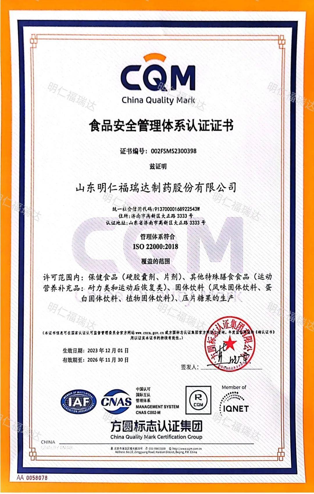 近日,明仁福瑞達順利通過食品安全管理體系和HACCP體系認證。