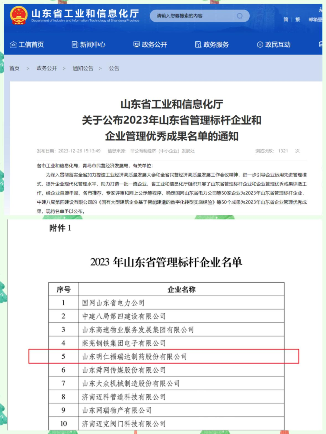 12月26日,山東省工業(yè)和信息化廳公布了2023年山東省管理標(biāo)桿企業(yè)和企業(yè)管理優(yōu)秀成果名單,明仁福瑞達(dá)憑借系統(tǒng)完備、科學(xué)規(guī)范、運(yùn)行高效的現(xiàn)代企業(yè)管理體系成功入選首批山東省管理標(biāo)桿企業(yè)。