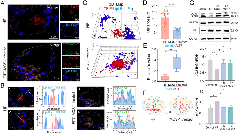 天然來源寡糖具有抗炎、抗腫瘤等重要生物活性,是省藥科院重要研究方向之一。為加速寡糖等天然藥物發現進程,研究團隊提出了單細胞器藥物示蹤策略,可實現直接原位可視化監測天然產物對細胞器功能的影響來快速鎖定潛在適應癥。團隊以省藥科院制備的海洋來源具有新穎結構的寡糖MOS-1為例,對MOS-1進行熒光標記,結合超分辨熒光成像技術等,實時示蹤MOS-1在細胞器中的定位、分布以及對細胞器功能的影響。研究顯示,MOS-1可定位于肝細胞內的溶酶體,并可改變脂滴的重分布,促進脂噬發生和細胞內脂質成分的代謝。這一結果揭示MOS-1可能是治療脂質相關疾病的候選藥物。研究人員進一步在動物模型中進行了驗證,發現MOS-1顯著促進甘油三酯降解,減少脂滴積聚,減輕肝損傷和脂肪變性。