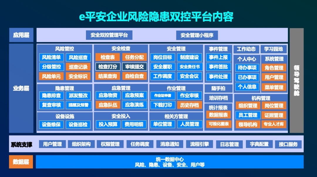 “e平安”企業(yè)風(fēng)險(xiǎn)隱患雙控管理項(xiàng)目充分應(yīng)用互聯(lián)網(wǎng)、大數(shù)據(jù)分析等新技術(shù),涵蓋新聞動(dòng)態(tài)、工作通知、安全通報(bào)、安全知識(shí)、法律法規(guī)、智能安全設(shè)備監(jiān)控等內(nèi)容。利用移動(dòng)辦公技術(shù),通過便捷化流程指引、專業(yè)化數(shù)據(jù)支撐,實(shí)現(xiàn)企業(yè)日常安全高效自主管理,助力企業(yè)持續(xù)提升安全管理水平、全面提升安全管理工作效率,數(shù)字化展現(xiàn)安全生產(chǎn)管理成果,為企業(yè)的發(fā)展保駕護(hù)航。