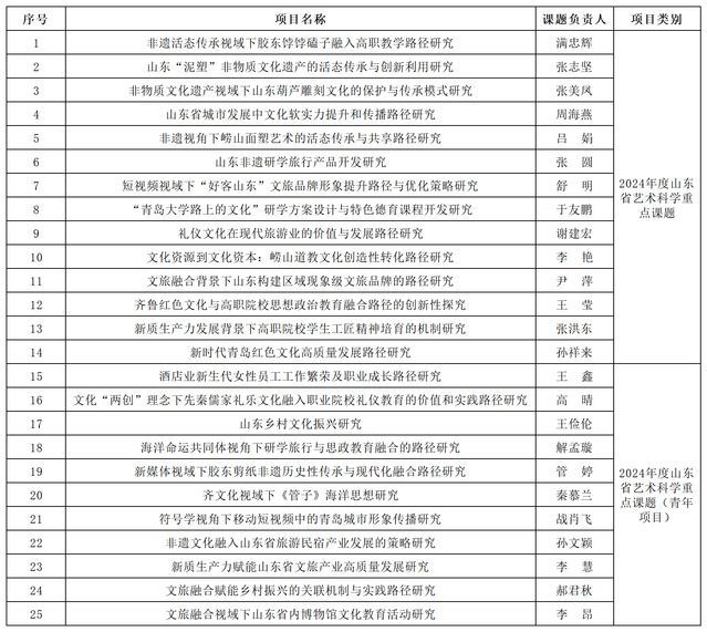 近日,山東省藝術(shù)科學(xué)重點(diǎn)課題評(píng)審辦公室公布了2024年度山東省藝術(shù)科學(xué)重點(diǎn)課題立項(xiàng)項(xiàng)目名單,青島酒店管理職院25項(xiàng)課題成功立項(xiàng),包括重點(diǎn)課題14項(xiàng)和重點(diǎn)課題(青年項(xiàng)目)11項(xiàng),立項(xiàng)數(shù)再創(chuàng)新高,標(biāo)志著學(xué)院在藝術(shù)科學(xué)研究領(lǐng)域取得了新的突破。