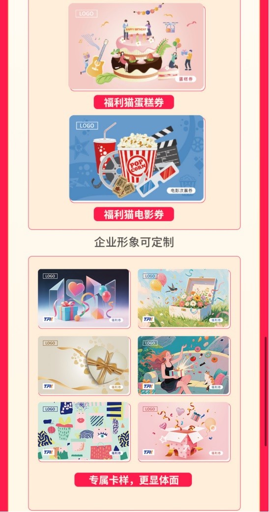 “魯商福利貓”平臺的核心優(yōu)勢在于其高度的定制化服務(wù)。企業(yè)可以根據(jù)自身需求,定制福利實體卡券的圖案,讓卡券獨具特色,展現(xiàn)企業(yè)文化和關(guān)懷。平臺還支持定制福利卡券類型,涵蓋提貨券、蛋糕券、電影券等多種類型,滿足員工在不同場景下的消費需求。此外,福利卡金額也可根據(jù)企業(yè)預算進行靈活定制,實現(xiàn)精準福利分配。