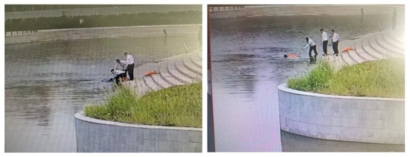 和超立即將現場情況上報物業(yè)監(jiān)控中心請求支援,并同步撥打報警電話,他自己則持續(xù)大聲與阿姨保持溝通、言語安撫,努力穩(wěn)定其情緒。張政則迅速跑向附近的應急物資存放點,取來救生圈與救生繩,奮力將救生圈拋投至阿姨附近水面,并高聲引導其抓住救生設備。很快,另一名聞訊趕來的隊員張萌也加入支援,三人默契配合、協(xié)力施救,最終成功將阿姨救助上岸。