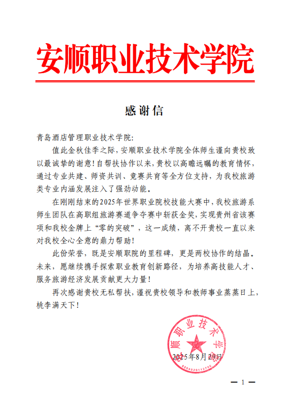 近日,青島酒店管理職院收到來自貴州安順職業(yè)技術(shù)學(xué)院的一封感謝信,對(duì)學(xué)校助力其在2025年世界職業(yè)院校技能大賽旅游賽道金獎(jiǎng)實(shí)現(xiàn)“零的突破”表示感謝,對(duì)學(xué)校幫扶協(xié)作工作的成效予以高度評(píng)價(jià)。