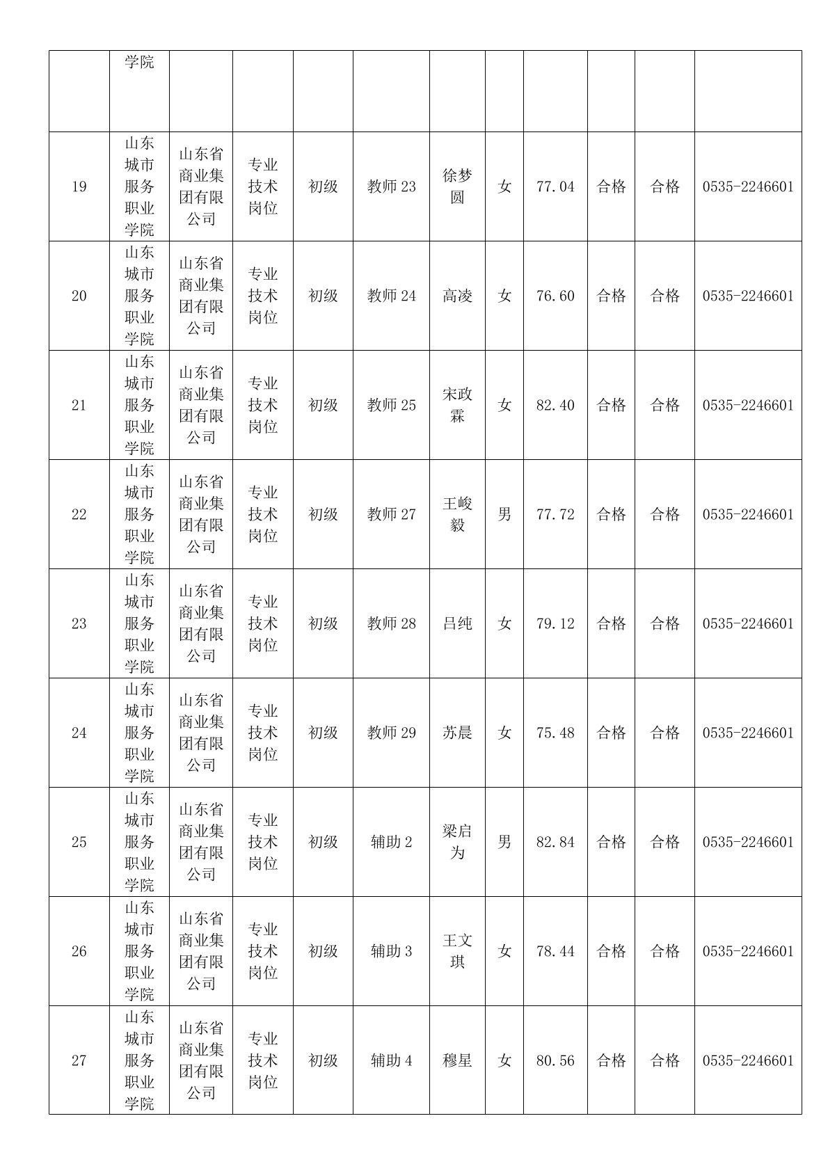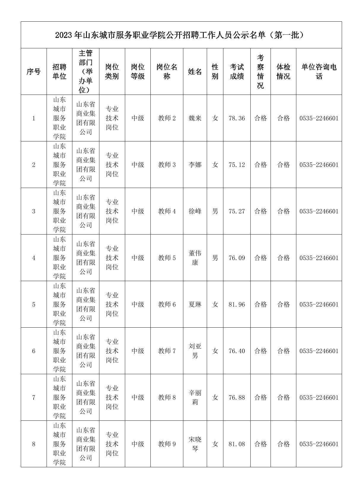 根據(jù)《中共山東省委組織部、山東省人力資源和社會保障廳關(guān)于印發(fā)2023年度省屬事業(yè)單位公開招聘工作實(shí)施方案的通知》(魯人社發(fā)〔2022〕23號)等相關(guān)規(guī)定,山東城市服務(wù)職業(yè)學(xué)院經(jīng)過公開招聘報(bào)名、考試、考察、體檢等工作,現(xiàn)對擬聘用人員(第一批)進(jìn)行公示,公示期為7個(gè)工作日,自2023年11月20日至2023年11月28日(不含節(jié)假日)。公示期間,如對公示人選有異議,請及時(shí)向山東省商業(yè)集團(tuán)有限公司反映。